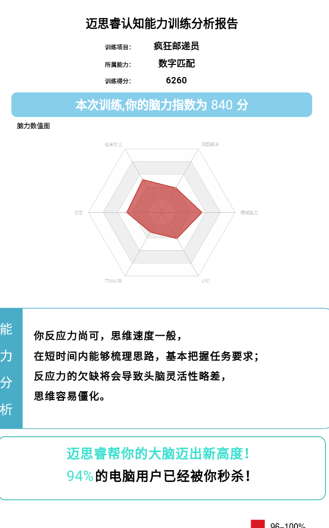 训练结束后,系统还会自动生成一份详尽的脑力分析报告,对你的各项能力指数进行评析,并针对你的弱势方面给予指导性建议。