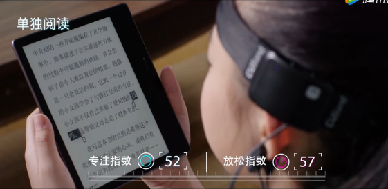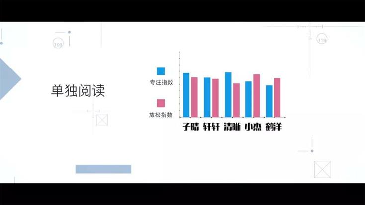 先是让孩子们分别独自阅读6~10分钟,后面的脑波数据监测系统同步监测和记录着每个孩子在看书时的大脑状态。屏幕上,孩子们的专注放松曲线时而平稳,时而起伏不定;