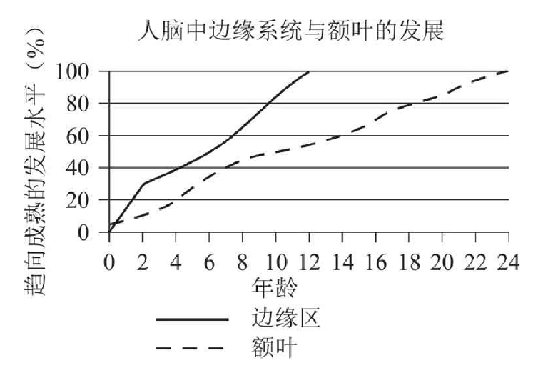 额叶(脑中的理智系统)的充分发展所花的时间要比边缘系统多10~12年,这可说明为何许多青少年常身陷险境