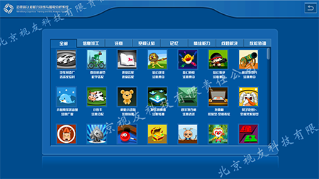 大脑360认知能力训练与脑电分析系统提供以下认知能力测评方法实现对信息加工速度、注意、空间认知、记忆、情绪、问题解决等认知能力进行测评:选择反应时、注意网络、视觉搜索、注意广度、注意瞬脱、圈数字、心理旋转、记忆再认、情绪理解、威斯康辛卡片分类。系统提供多种认知训练游戏:速度匹配、梦幻拔河、梦幻穿梭、脑波炮炮兵、快乐跳舞毯、舒尔特方格、折叠箱、兔子吃萝卜、桌球记忆、视友餐厅、情绪消消乐、趣味图形、顽皮跳棋、究极速算等,系统地对学生的情智能力进行训练提升。