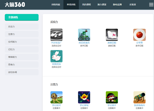 大脑360从大脑的功能出发(记忆力、注意力、问题解决能力、信息加工速度、情绪理解能力以及空间能力),提供配套的训练方法,其目的就是为了加强神经元和神经元之间的神经通路连接,以强化上述说的六大认知能力。