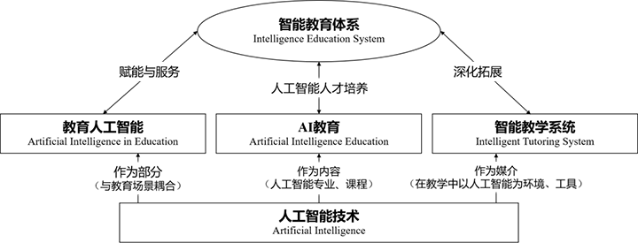 早期人们对“智能教育”、“人工智能教育(AI教育)”概念往往混淆使用,如2002年我国召开的第一届全国人工智教育学术会议主题便是“信息时代的智能教育”[7]。目前,教育技术研究者对上述两个概念的区别与联系已基本达成共识:从教育整体发展的视角看,智能教育(Intelligent Education,IE)是利用智能技术构造智能化学习环境,优化人工智能知识的教学内容,开发、创新适切性的教学方法,提高教学效率和教学水平,促进学习者全面而有个性的发展;而AI教育(Artificial Intelligence Education,AIE)担负着人工智能人才培养的任务,即以人工智能技术为教育内容,通过设置人工智能专业或课程,让学习者学习人工智能技术的相关知识、原理并加以应用,提升其人工智能素养,以培养多层次的专业人才。
