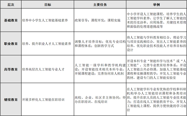 结合不同学习者的特点,在多层次AI教育体系中各层次AI教育的目标和主要任务各有所侧重、相互补充,保证了多类型、多层次人工智能人才培养的需要,如表1所示。总的来说,基础教育侧重基础训练,其目标是培养中小学生的人工智能基础素养,推动人工智能教育的普及;职业教育以职业训练为主,其重点是培养职业人才的人工智能素养与应用能力;高等教育重点开展专业教育,关注高层次人工智能专业人才培养;继续教育则主要开展在职培训,培养在职人员的人工智能应用能力。