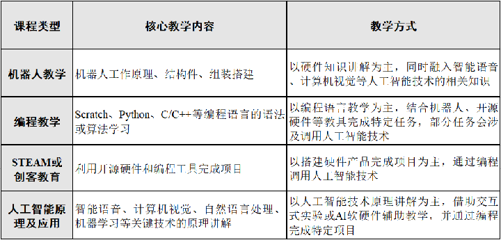 从AI教育在中小学的实践来看,目前国内外对于如何开设AI课程还未形成统一的标准。本研究认为,根据核心教学内容的不同,可将AI课程大致分为四种类型,如表2所示。这四种类型的AI课程各有侧重但内容有交叉,均涉及人工智能技术相关知识。其中,人工智能关键领域技术和关键通用技术可细分为自然语言处理、智能语音、计算机视觉、机器学习等方向[14]。结合《普通高中信息技术课程标准(2017年版)》对学科核心素养和“人工智能初步”模块的教学内容要求,基础教育阶段的AI课程应提炼机器学习核心思想,并将其融入智能语音、计算机视觉和自然语言处理等具体应用场景,充分运用机器人、编程等载体加深学生对人工智能技术原理的认识;各阶段AI课程的教学内容应注重衔接,围绕人工智能关键技术应用对机器人教学、编程教学和STEAM等教学内容优化重构,以推进AI课程的体系化建设。