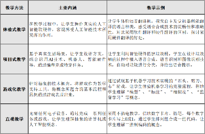 AI技术知识覆盖面广、内容抽象、概念繁多、实操性强,具有一定的学习门槛,亟需探索适应本学科特点的教学模式。为帮助学生理解课程内容,提升学习兴趣,教师需运用新的教学理念和方法授课,以确保AI课程教学的生动性、有效性。例如,教师可以利用计算机仿真、AR/VR等技术,创设虚拟逼真的教学情境,以满足多层次、多样性的教学需求;在中小学AI课程教学中,常用的教学模式有体验式教学、项目式教学、游戏化教学和直观教学等,如表3所示。
